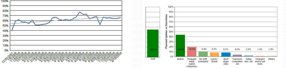 Cycle time in Minutes Part Count Utilization Progress Weekly Machines Performance Utilization progress over time (90-days) Reasons for idle time vs. goal (Last week)